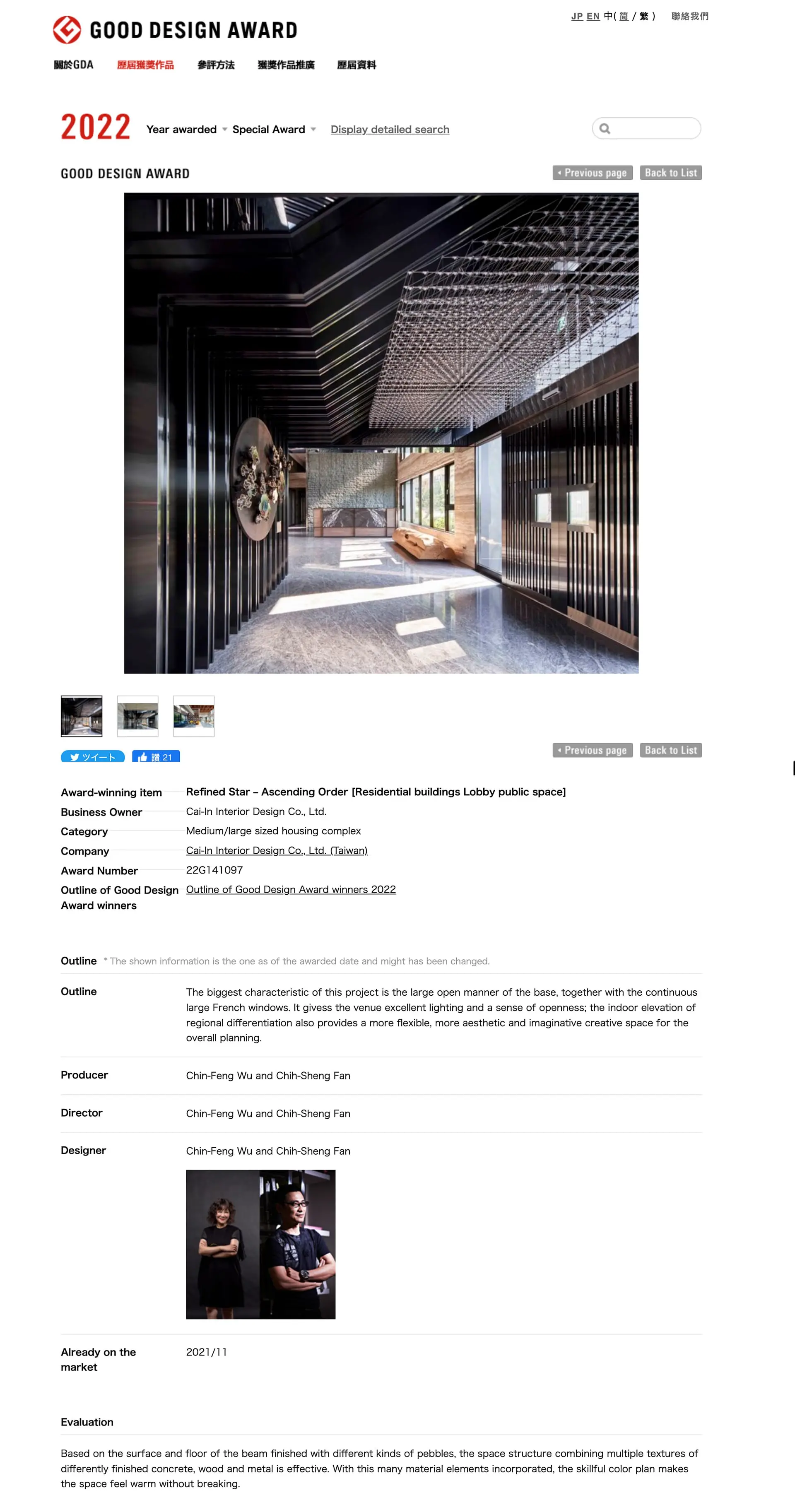 得獎訊息-GOOD DESIGN AWARD網址連結: https://www.g-mark.org/award/describe/54140?token=MTmMloQejH